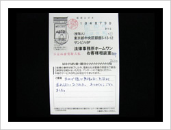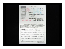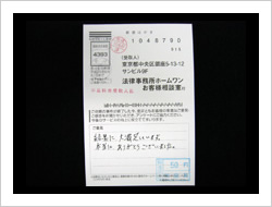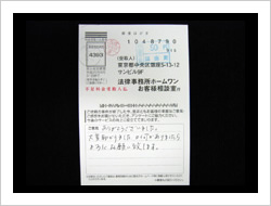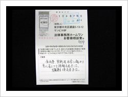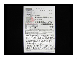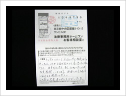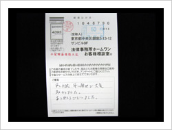 最初はいろんな事が不安でした。成功報しゅうの他に雑費等の費用がいるのではないかとか過払が本当にもどってくるのだろうか・・・とか。でも親切な対応、たびたびのお手紙などで本当に安心して待つ事ができました。ありがとうございました。