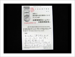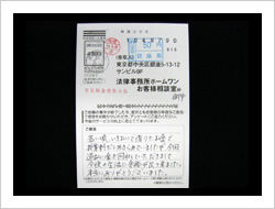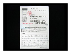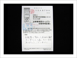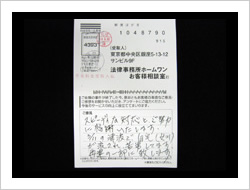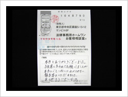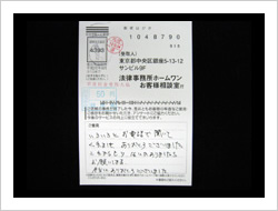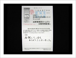 御社のおかげで毎月の支払に頭を痛める事なく生活できる様になりました。家族の者にも知られる事なく借金がなくなった上に仮払い金まで取り戻して頂きありがとうございました。これからは地道に暮らしていきます。