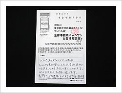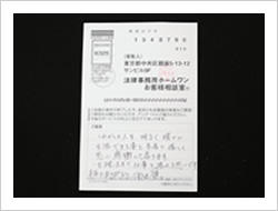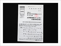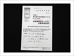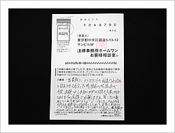 毎月、多額の返済を相談する相手もなく、長年続けて参りました。思い切ってメールを送ったところ、迅速で、とても親切に対応して戴き、心が休まりました。先生はじめ、事務方の優しく、ていねいな対応を心から御礼申し上げます。これからは、この過払金を、大切に、地道な生活へと立て直していこうと思いを新たにしています。どうぞおからだ大切に借金や生活に苦しんでおられる方々のお力添えをお願い致します。(お手紙より一部要約)