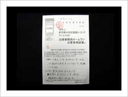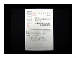 初めての相談の電話をした時、私自身初めての経験の事で無理と思いあきらめてましたが、再度電話をホームワンさんからもらって今回全て解決する事ができ感謝してます。ホームワンさんには私のように1回の電話であきらめてしまう人のため再度連絡の電話をこれからもかけて1人でも解決の糸口を見つける事が出来るようにと思います。本当にありがとうございました。