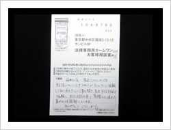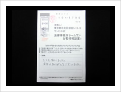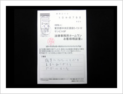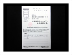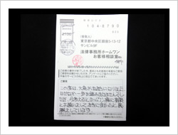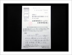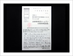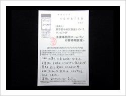 今回の私儀の解決に、速やかに対処していただき、本当に有りがとうございました。事務所の皆さまのTELでの対処のスピーディーさと、対応対話に感謝し、安心して、責務をまっとうする事に集中できました事、改めて感謝申し上げお礼にかえさせていただきます。