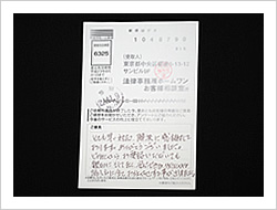 今、涙が止まらないくらいくれしいです。ずっと悩んでいたので、解決したとお電話いただいた時、肩の荷がおりたように軽い気持ちになりました。弁護士さんを始め、事務所の方々には深くお礼を言いたいです。本当に本当にありがとうございました。