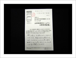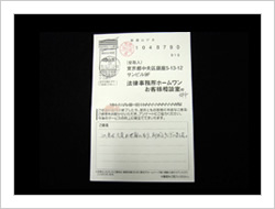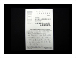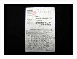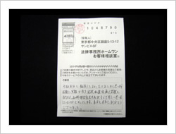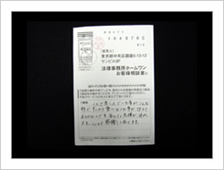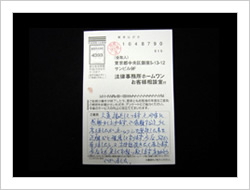 申し込みから解決の今日までいろいろお世話になりありがとうございました。今日までどうすればいいか解決できるか一人で悩んでいましたが相談して本当に良かったと思い感謝しています。本当にありがとうございました。