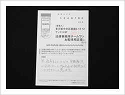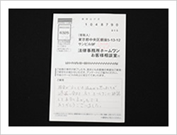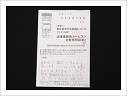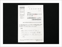 電話するまでが、思い悩みました。弁護士さんの説明で不安がなくなり、今では電話したことを良かったと思います。ホームワンさんのお陰で今まで借りていた借金が返すことが出来、肩の荷がおり何とお礼を言ったらいいのか、感謝しております。ありがとうございました。