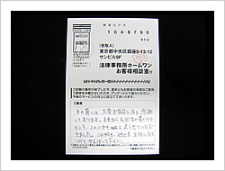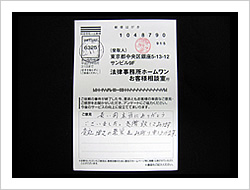 このたびは主人の債務整理に丁寧に取り組んでいただき、ありがとうございました。生活も少しずつ落ち着きを取り戻し、2人でがんばっているところです。気持ち的にも終わりが見え安心し、本当に心からほっとしています。今後もみなさまのご活躍を期待しております。本当にありがとうございました。