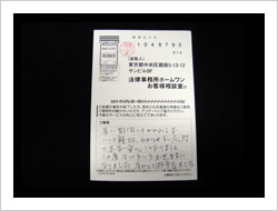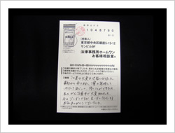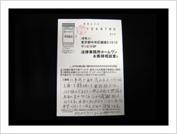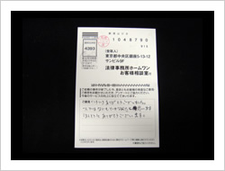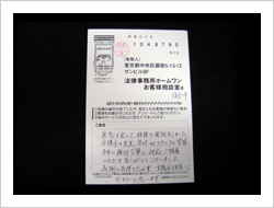 勇気を出して相談の電話をしました。弁護士の先生、受付のスタッフの皆様、本当に親切丁寧に対応ご指導いただき有難うございました。感謝の気持ちを忘れず、一生懸命頑張っていきたいと思います。