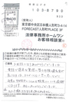 ホームワンでは、債務整理をご依頼されて、事件が終了されたお客様を対象にしたアンケート調査を実施しております。お客様からお寄せいただいたご意見・ご要望・ご指摘は、いったん「お客様相談室」に集約し、改善策を検討したうえで、事務所のメンバー全員で業務改善に取り組みます。