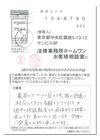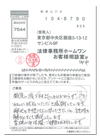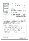 裏面のアンケートの通りです。特に、迅速に対応して下さり有難うございました。又、途中の経過報告など、具体的で非常に安心できて良かったと思います。今後のご発展をお祈り申し上げます。