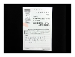 意見でなないですが、こんなになる前にもっと早くホームワンを知っておけば良かったと思う。本当にありがとうございました。ホームワン法律事務所の発展を祈ります。