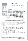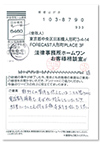 大変お世話になりました。思った以上の示談金にびっくり致しました。流石、法律事務所ホームワンです。今後何かありましたら、また相談致します。