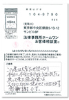 ホームワンでは、債務整理をご依頼されて、事件が終了されたお客様を対象にしたアンケート調査を実施しております。お客様からお寄せいただいたご意見・ご要望・ご指摘は、いったん「お客様相談室」に集約し、改善策を検討したうえで、事務所のメンバー全員で業務改善に取り組みます。