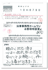ホームワンでは、債務整理をご依頼されて、事件が終了されたお客様を対象にしたアンケート調査を実施しております。お客様からお寄せいただいたご意見・ご要望・ご指摘は、いったん「お客様相談室」に集約し、改善策を検討したうえで、事務所のメンバー全員で業務改善に取り組みます。