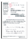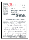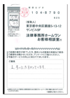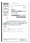 今回依頼する前に、別の事務所が私の住んでいる所で無料相談があったので行ったのですが、人の話を全く聞かず、上から目線で、弁護士さんてこんなもんだと思っていました。テレビでホームワンを知り、一緒だったらやめようと思っていましたが、全く違っていました。本当にお願いして良かったです。ありがとうございました。うれしかったです。