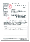 過払い金の請求を早く解決していただき有り難うございます。消費者は泣き寝入りするだけなので、大変助かりました。本当に感謝しております。