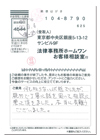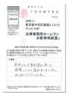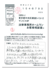 ここ数年間はどこに相談したらいいのやら、テレビやラジオで色々と聞く法律事務所の名前・・・思い切ってホームワンに電話してみて、対応も良くて本当に助かりました。ありがとうございました。
