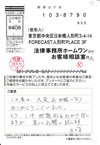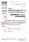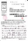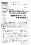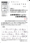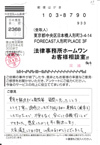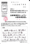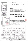 この度は大変お世話になりました。抱え込んでいた問題を思いきってで相談させて頂きましたが、長い期間複雑な処理を丁寧に進めて頂き今後の一歩を改めて踏み出すことが出来、大変感謝しております。