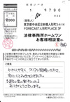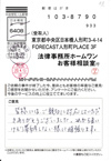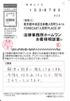 費用や解決までの期間等、疑問に思ったことを、とても丁寧に説明していただきました。こまめに連絡を(進捗を)いただけたので、不安もなく、安心して依頼することができました。想定したよりも早く解決に至り、大変満足しております。この度はありがとうございました。