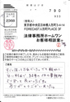すごく困って不安でした。でも親切に安い料金で、結果の他の事務所よりずっと良かったです。ありがとうございました。
